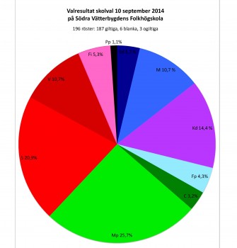 Igår, den 10 september, genomförde vi skolval här på SVF. Valresultatet gav Mp 25% av rösterna, S 20,9%, Kd 14,4%, V och M 10,7% vardera, Fi 5,3%, Fp 4,3%, Sd 3,7%, C 3,2%, och Pp 1,1%. I SVF:s riksdag skulle Miljöpartiet, Socialdemokraterna, Vänsterpartiet, Kristdemokraterna, Moderaterna, Folkpartiet och Feministiskt initiativ få mandat, medan Centern, Sverigedemokraterna och Piratpartiet hamnar utanför.